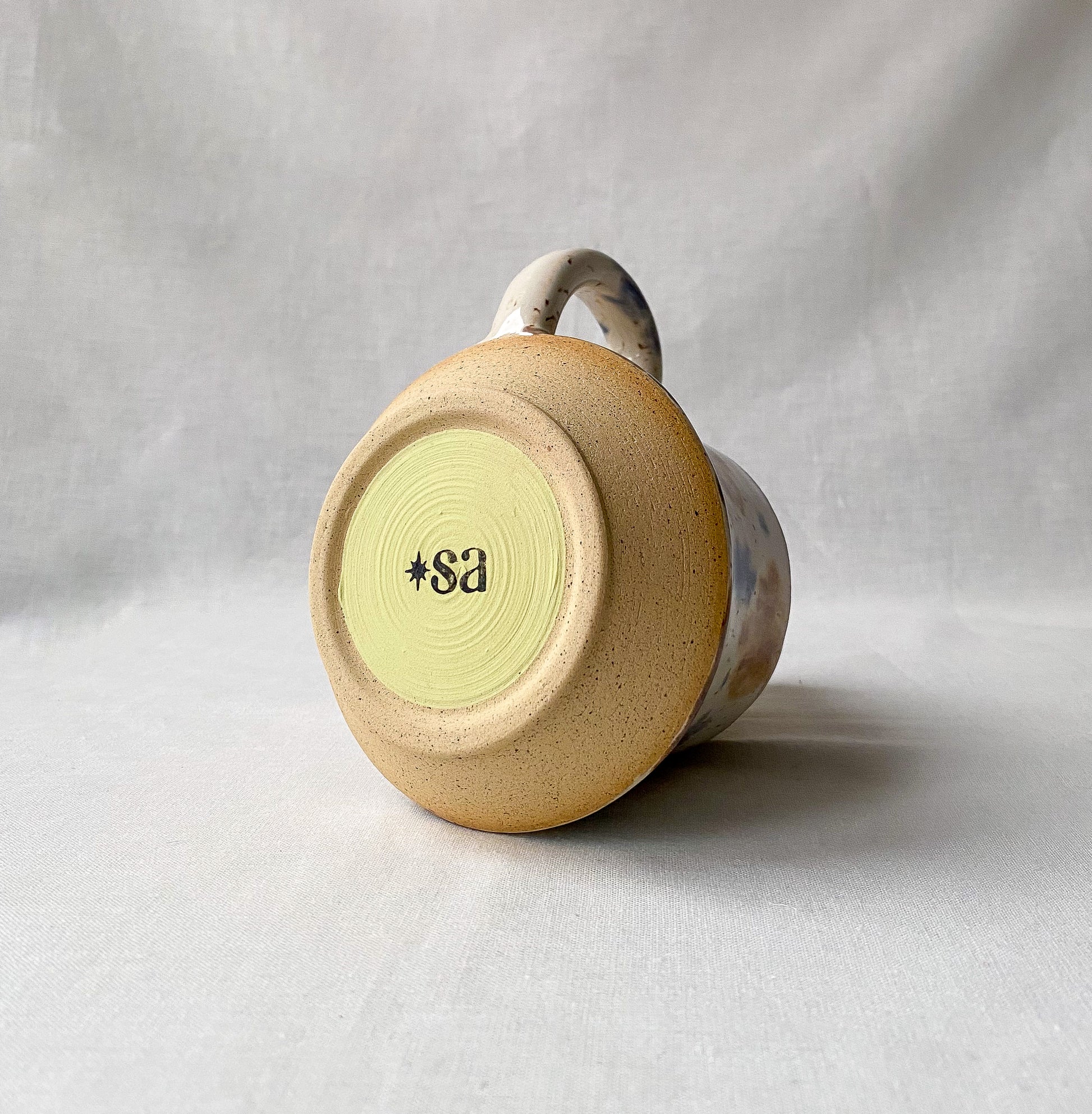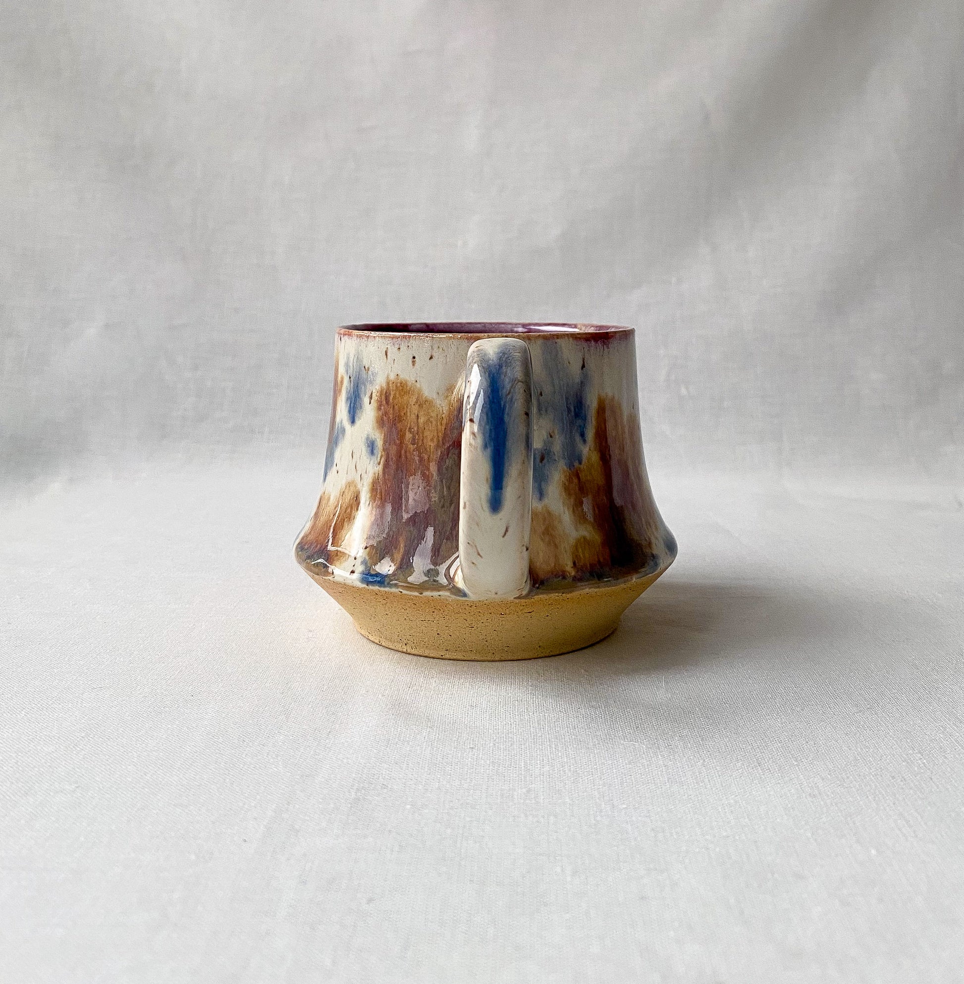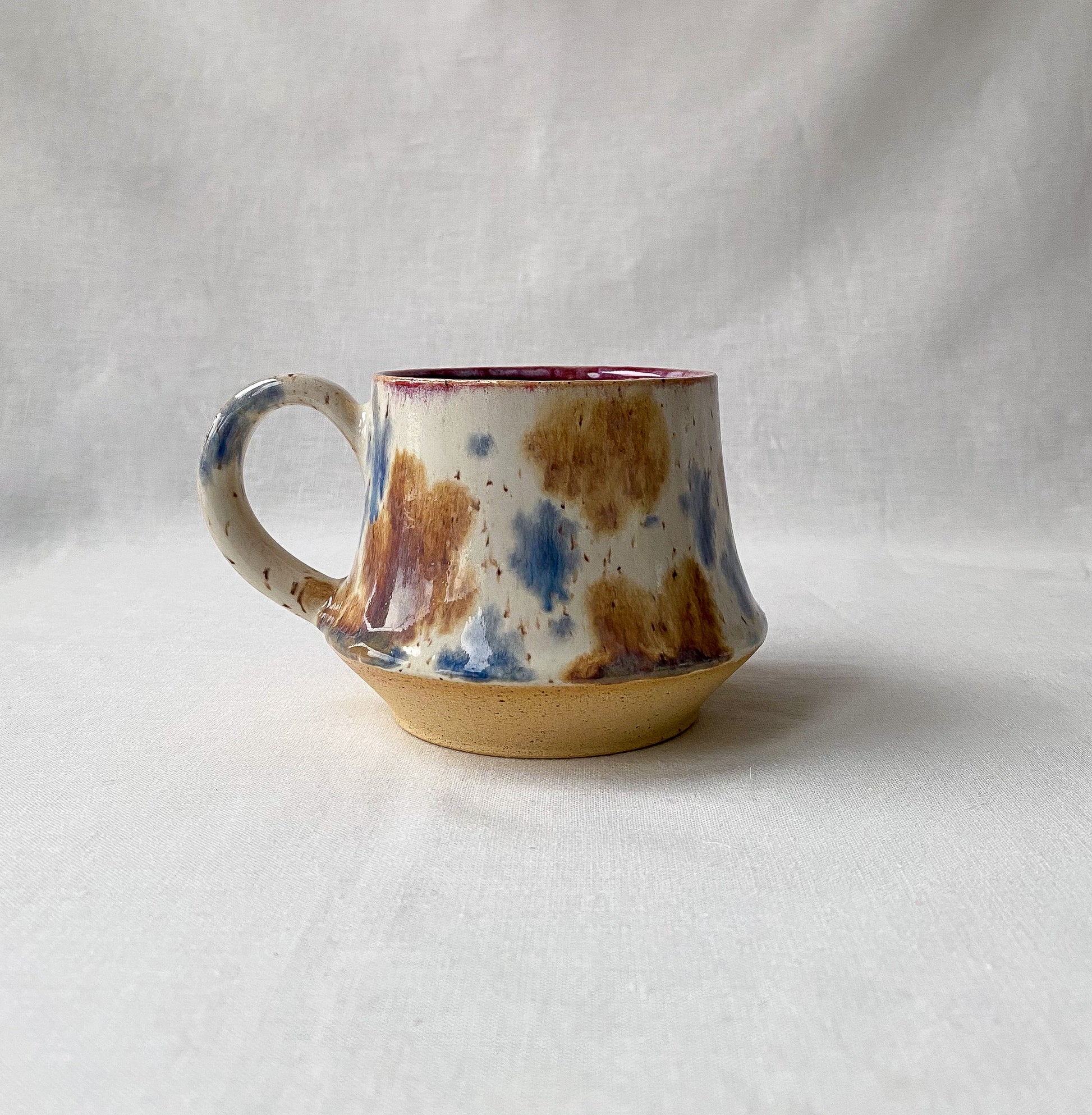 Medium mug in abstract brown and blue flower pattern, dark fuchsia interior glaze.