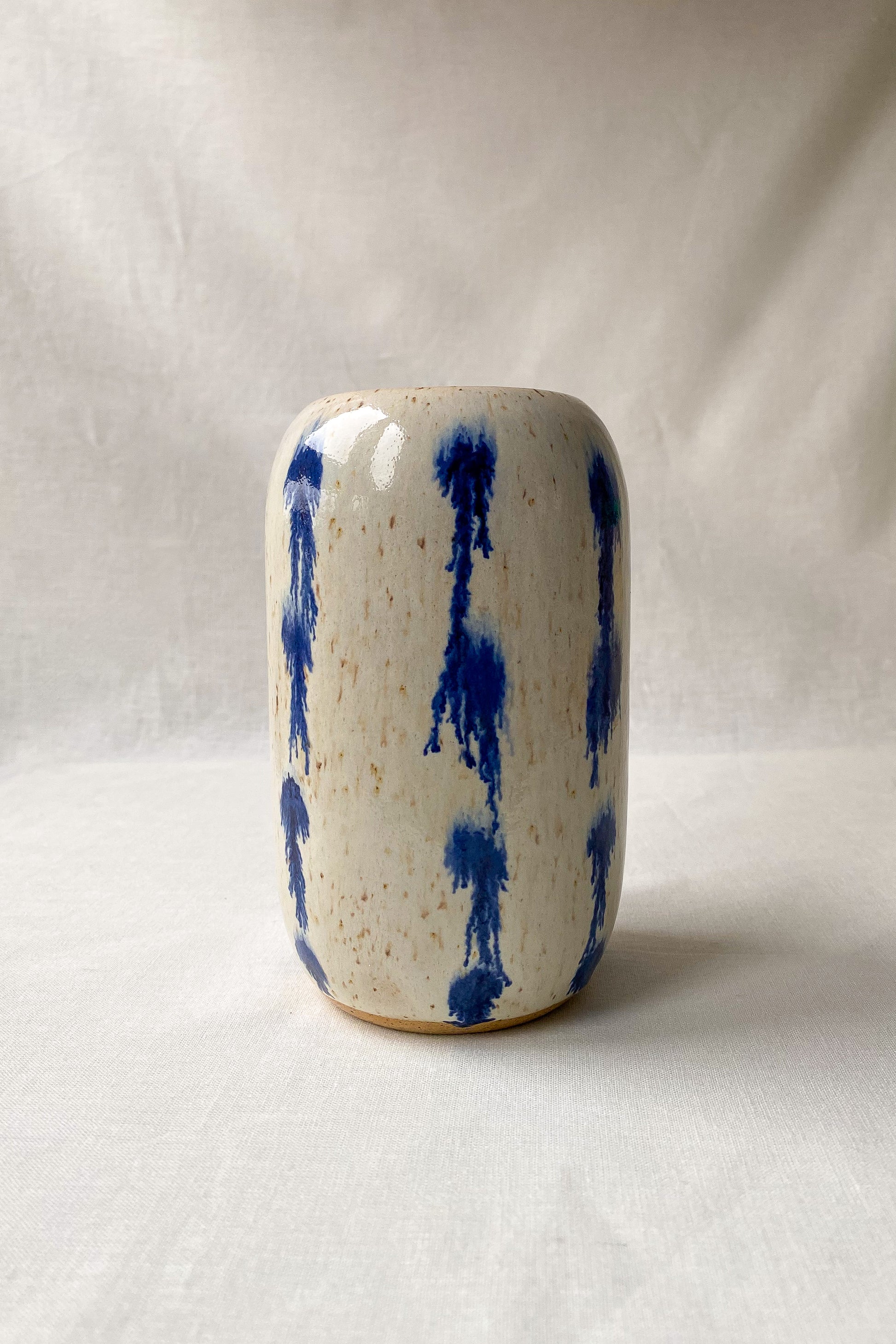 Pill-shaped vase in a creamy white glaze with melty cobalt detail.