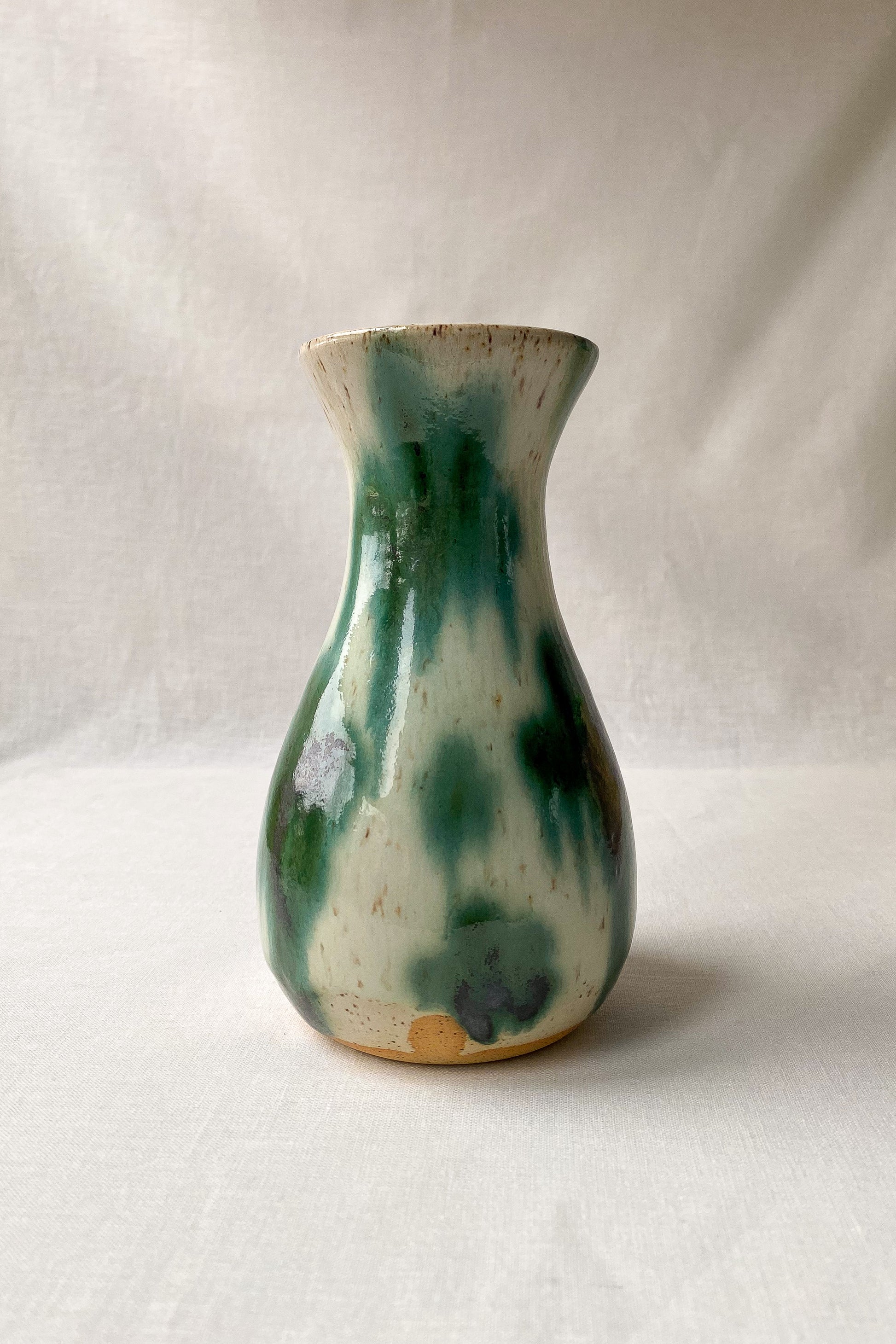 Gently rounded vase, creamy white glaze with copper green abstract detail.