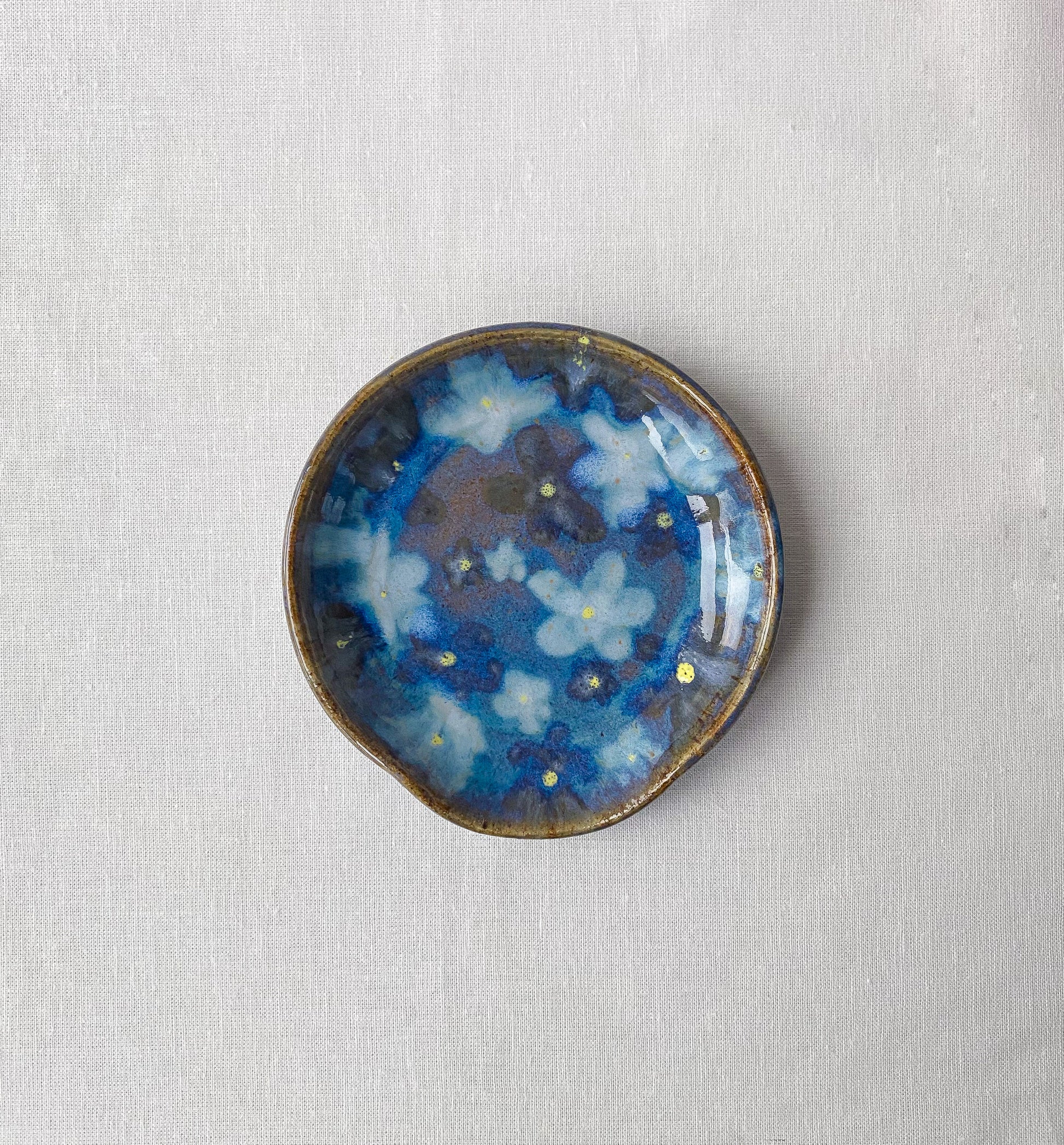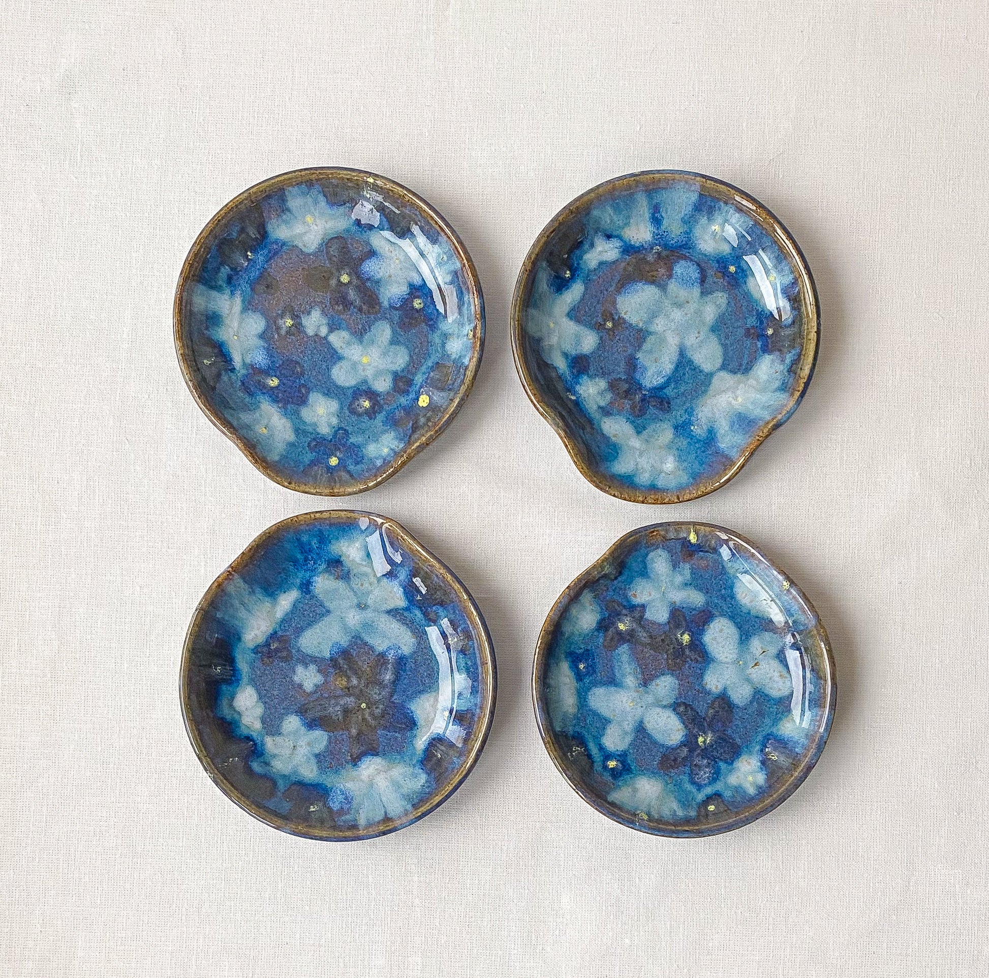 Blue spoon rest with abstract ditsy flower pattern. Each piece is hand painted, so there are slight variations in flower size and placement.