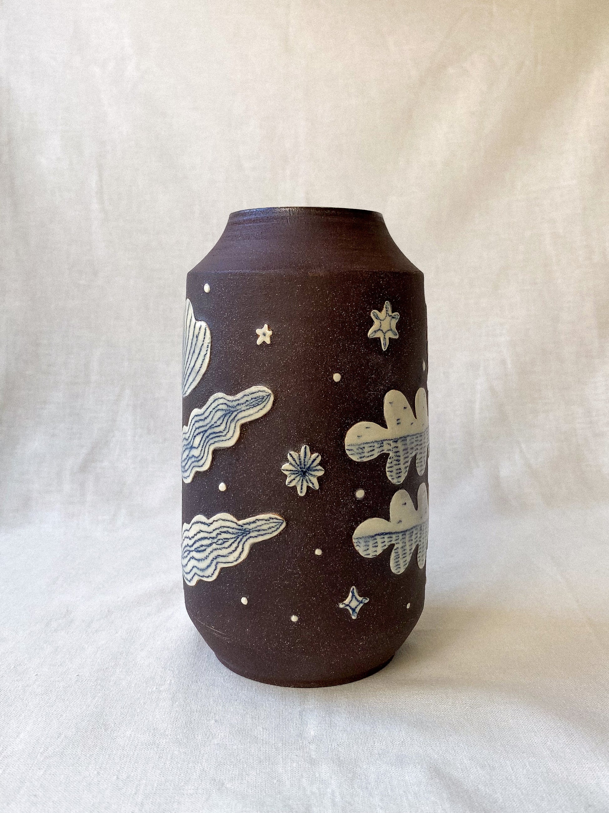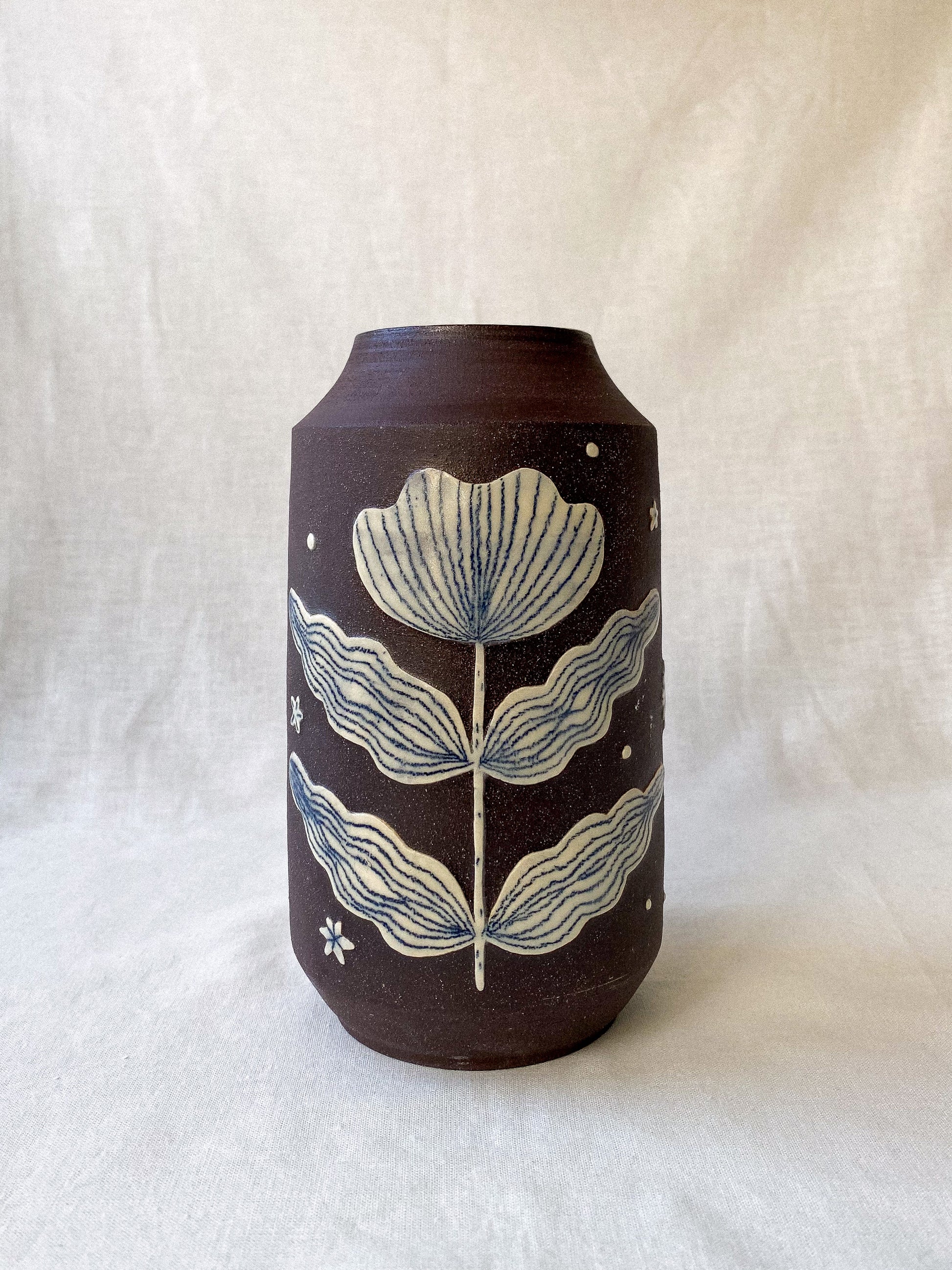 Hand-illustrated vase in a dark coffee clay with a raised white floral motif.