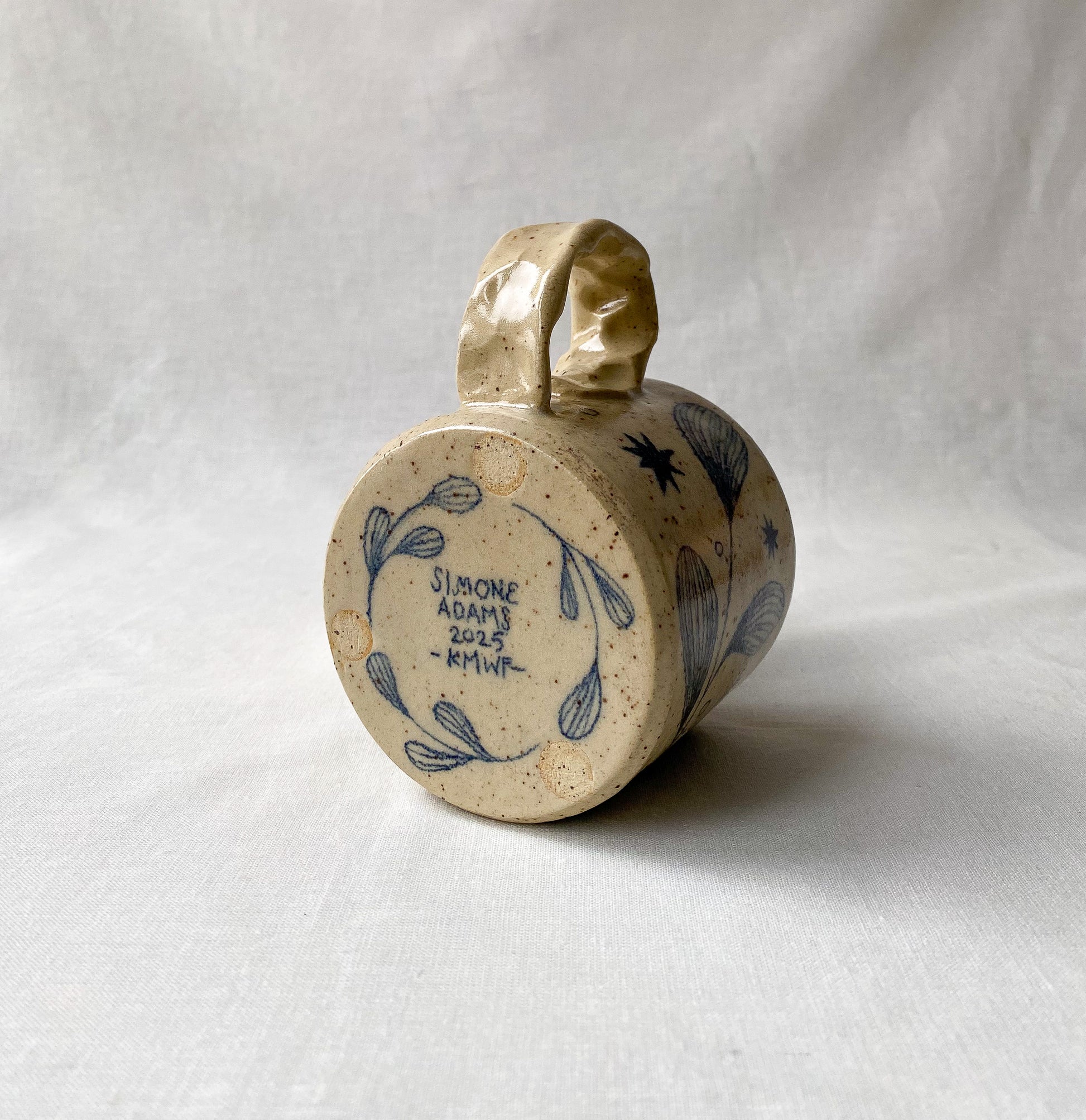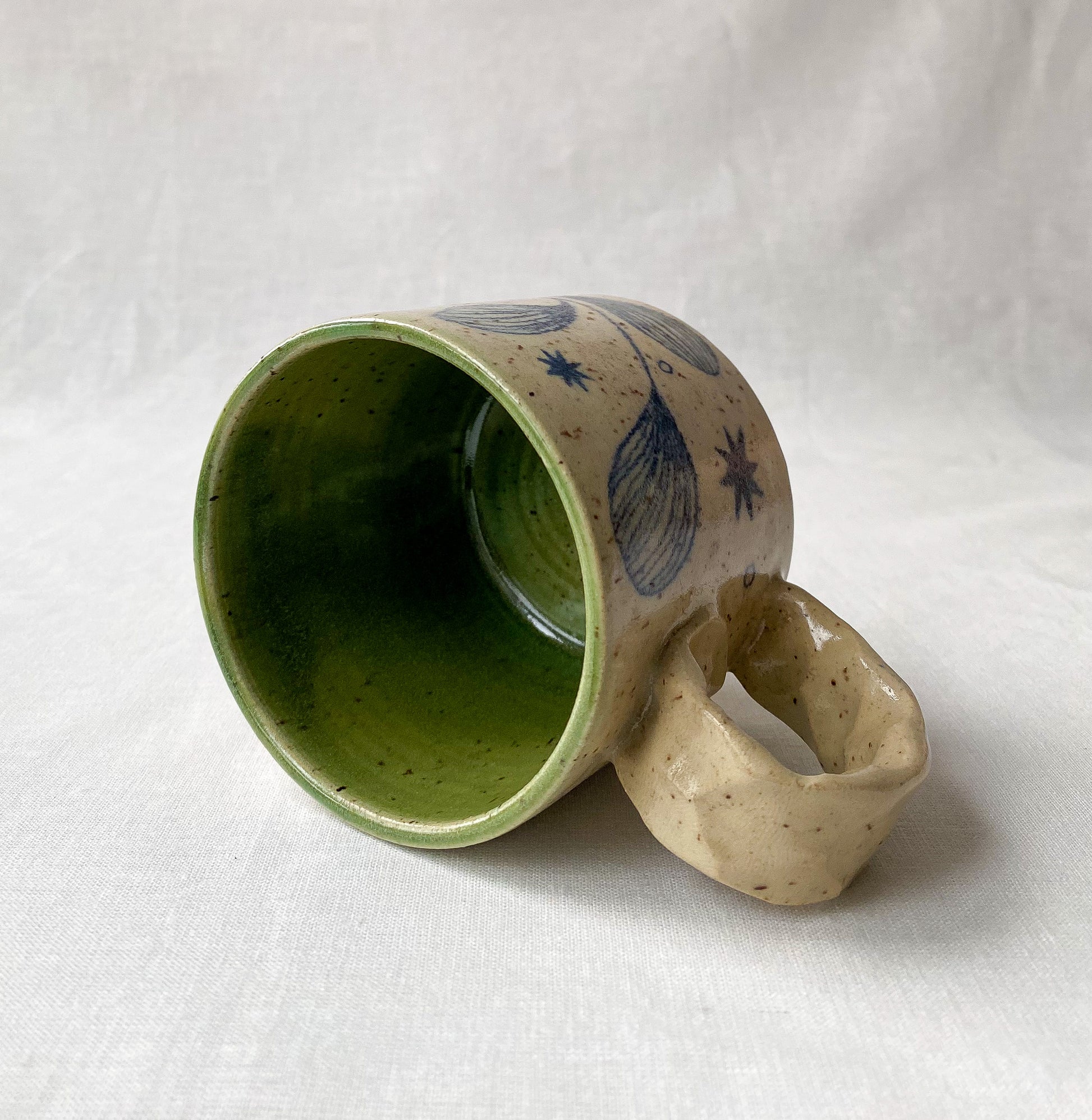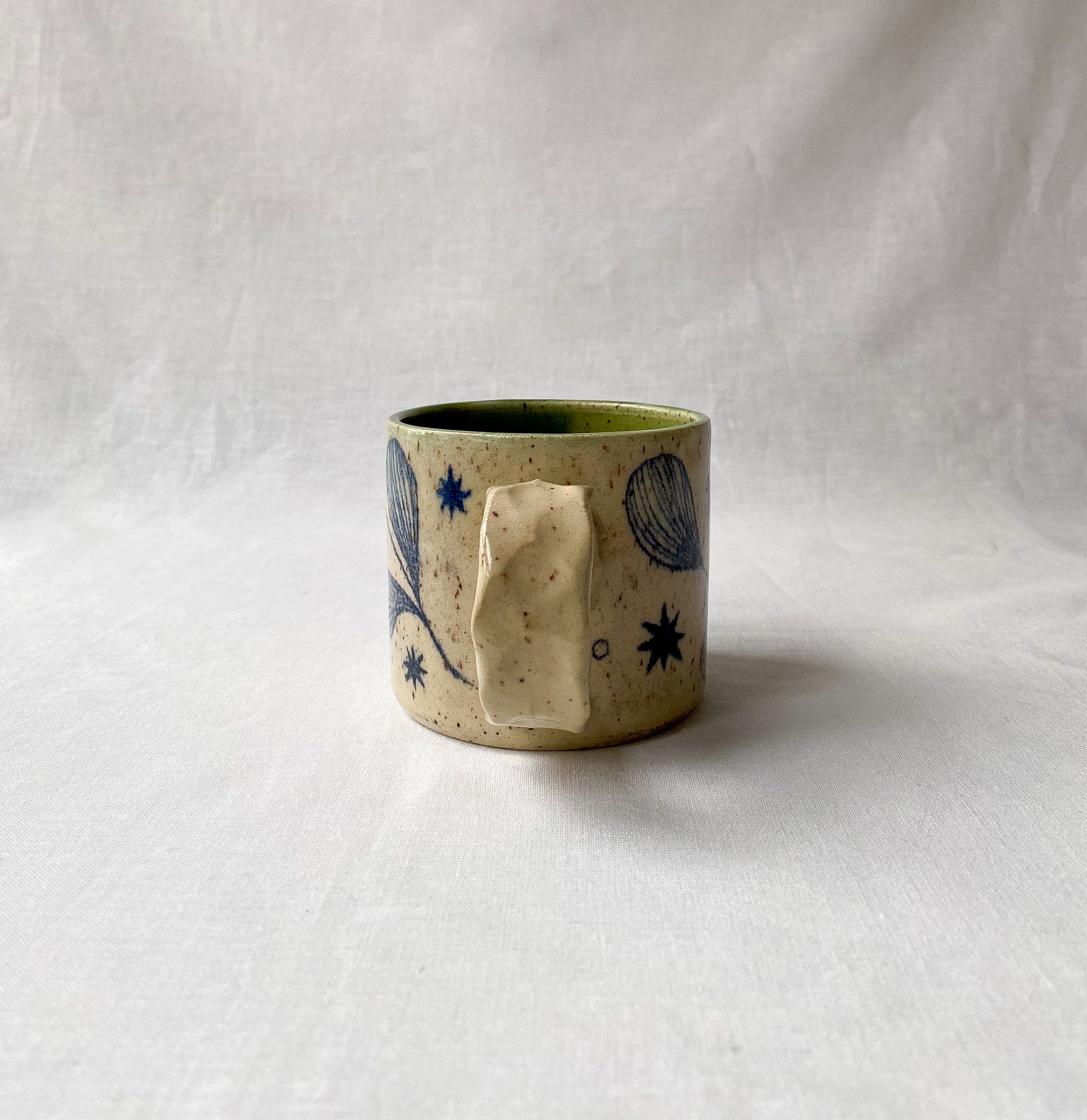 Hand drawn leaf and star motif, satin clear glaze with dark green interior glaze. Standard mug with pinched handle.