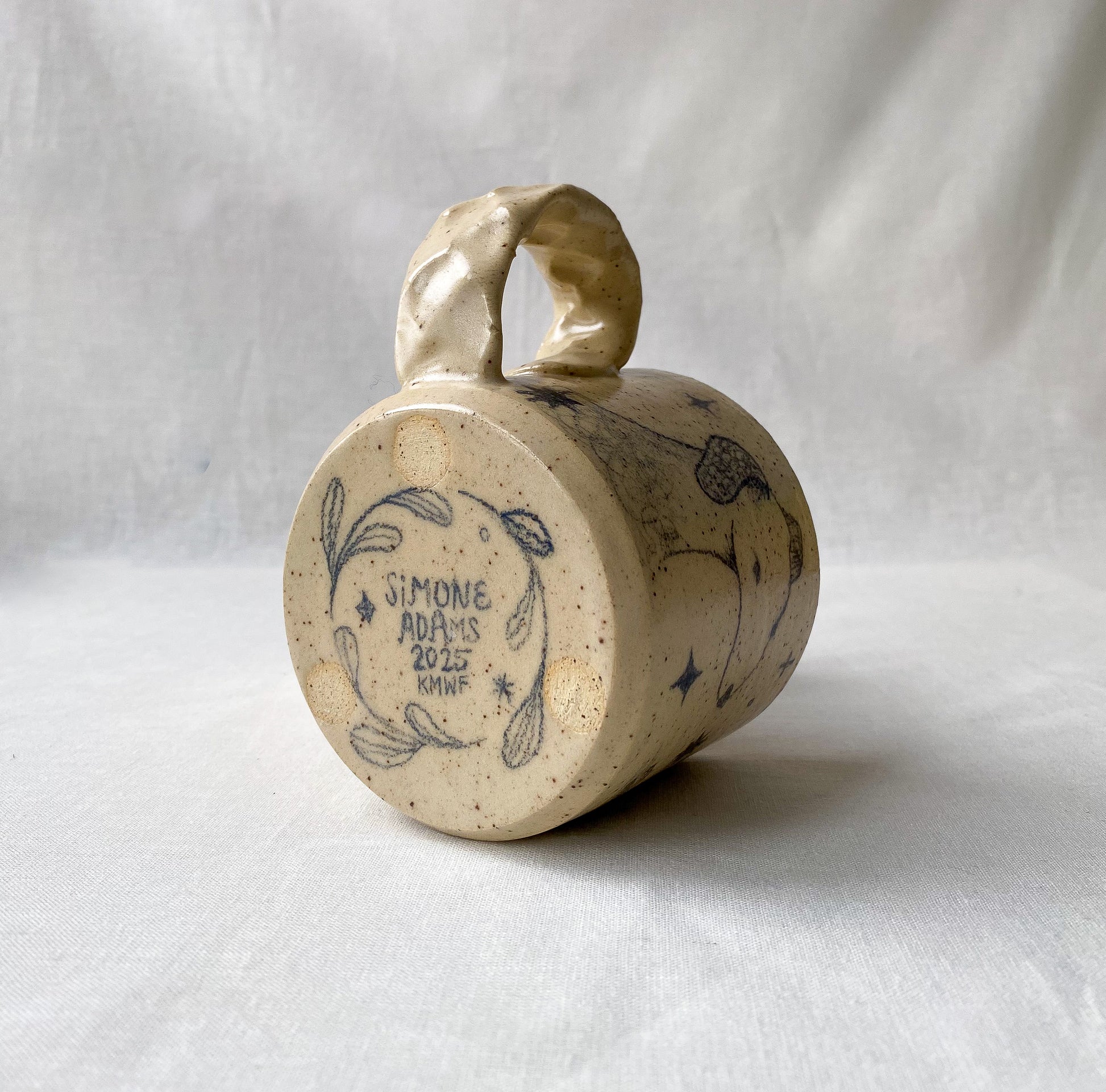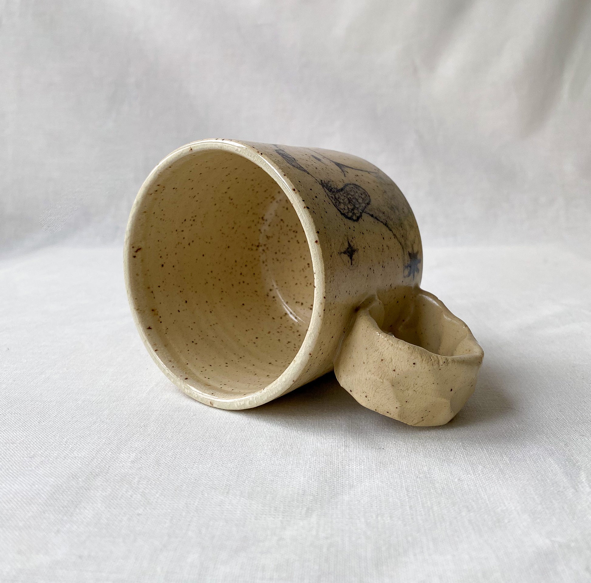 Hand drawn dogs and stars, satin clear glaze. Standard mug with pinched handle.