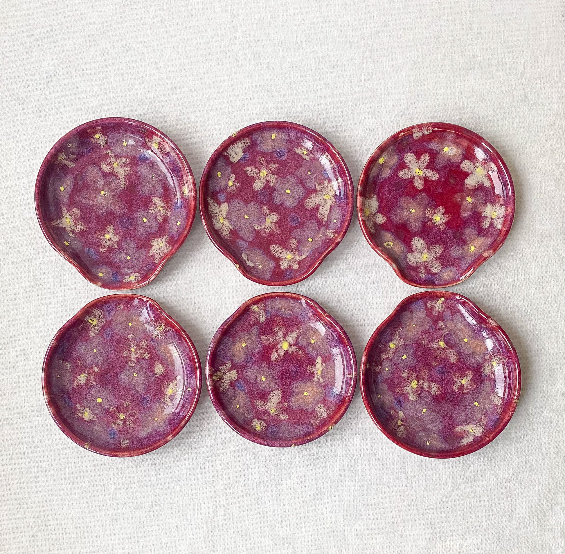 Red spoon rest with abstract ditsy flower pattern. Each piece is hand painted, so there are slight variations in flower size and placement.