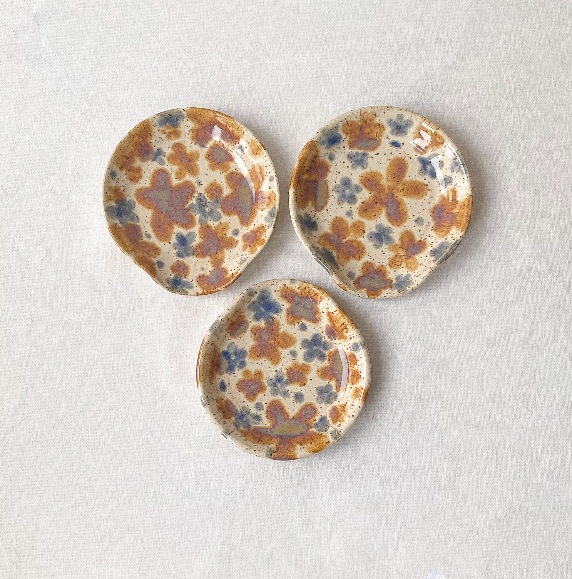 White spoon rest with abstract ditsy flower pattern in brown and blue. Each piece is hand painted, so there are slight variations.