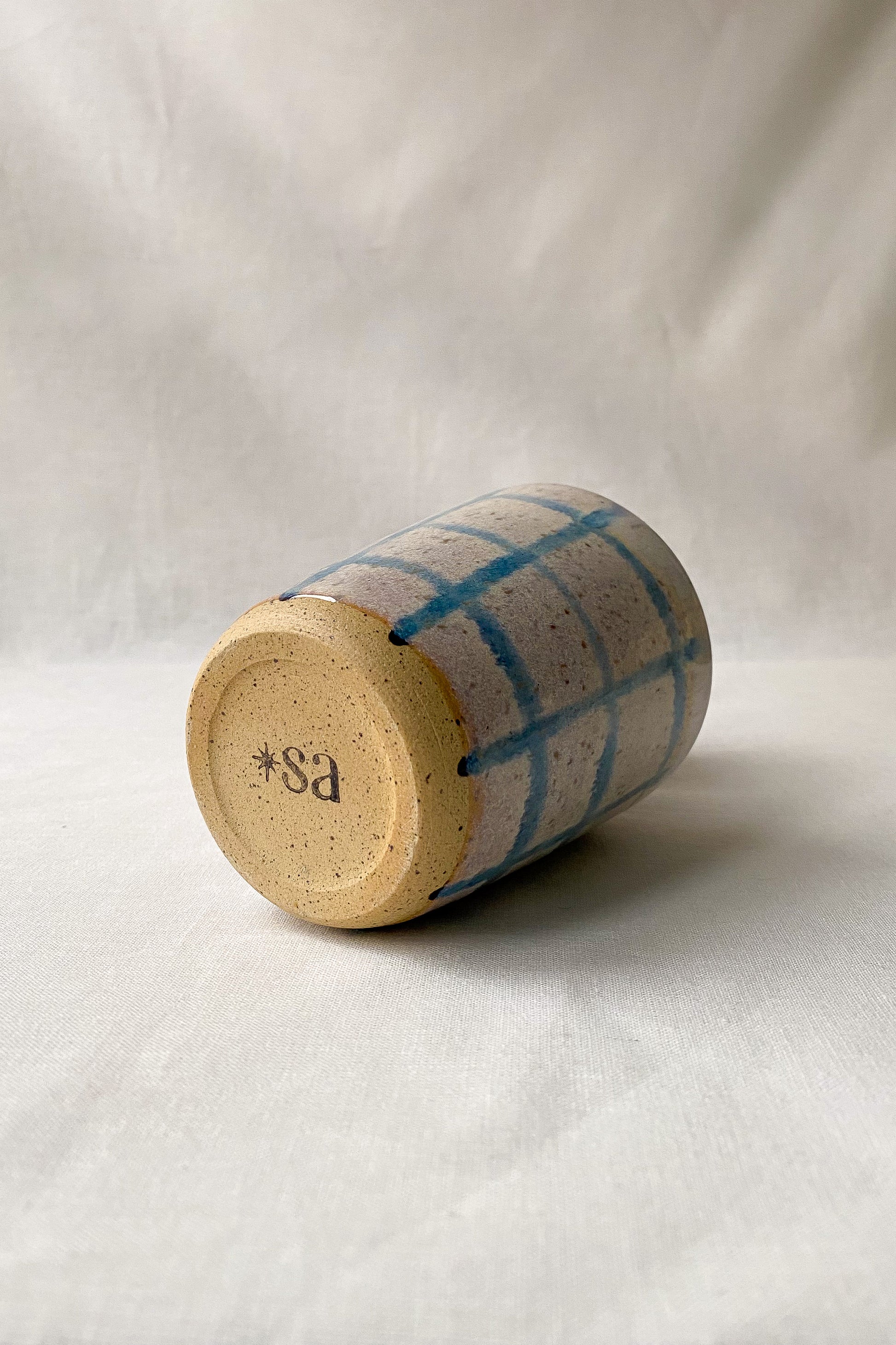 Tall opalescent cup with blue grid detail. Can be purchased with its pair or alone.