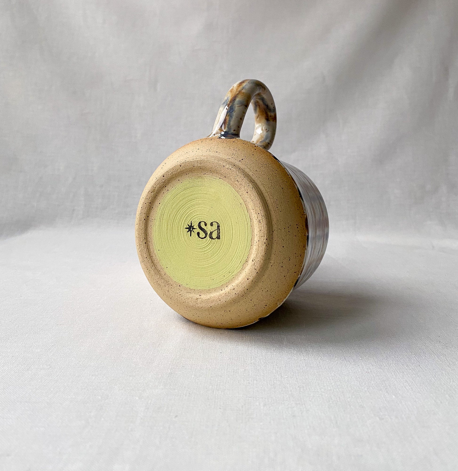 Big morning mug in brown and blue plaid, dark fuchsia interior glaze.