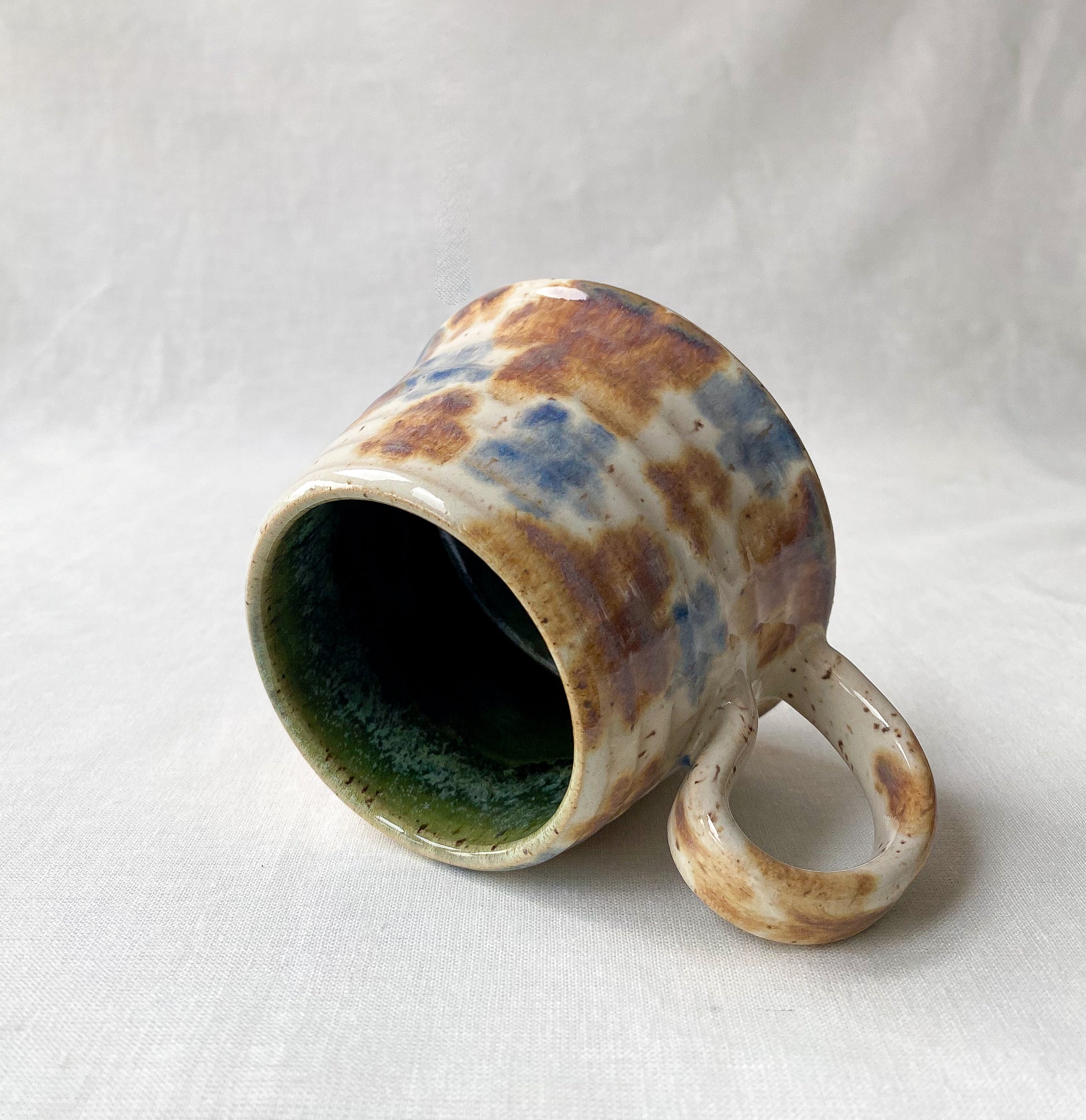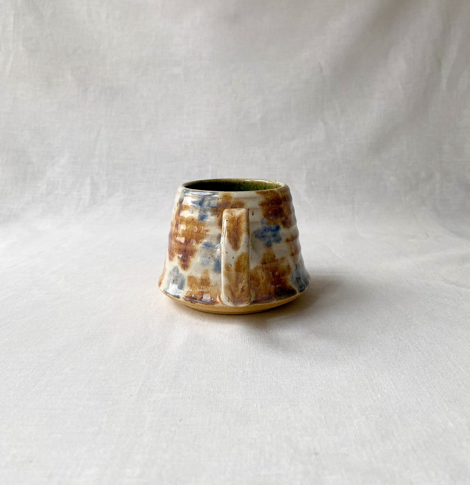 Short mug with brown and blue abstract floral pattern, deep green interior glaze.