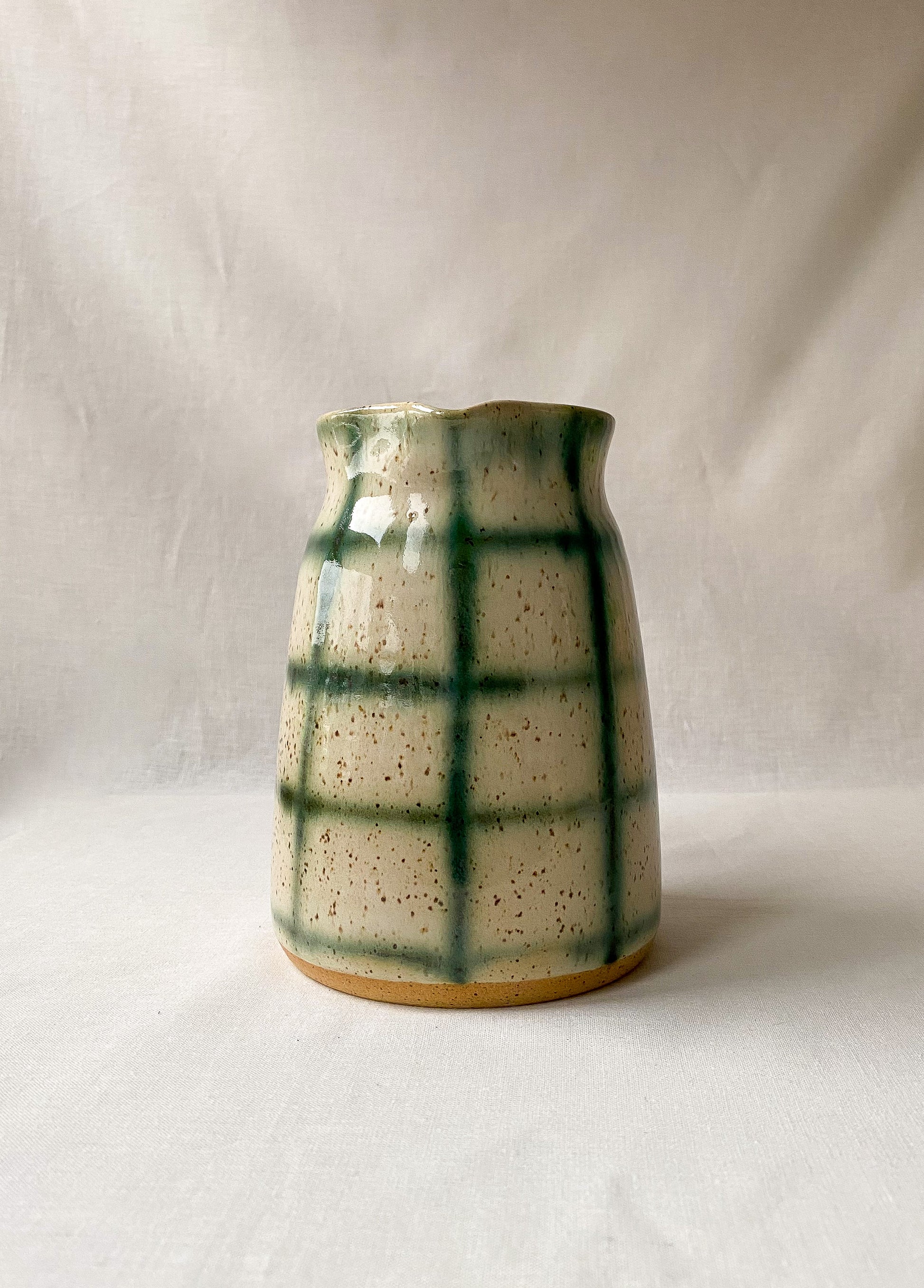 Speckled pitcher in a creamy white glaze with a copper green grid detail. Meant to be paired with White + Green Grid Cups, but can be sold alone.